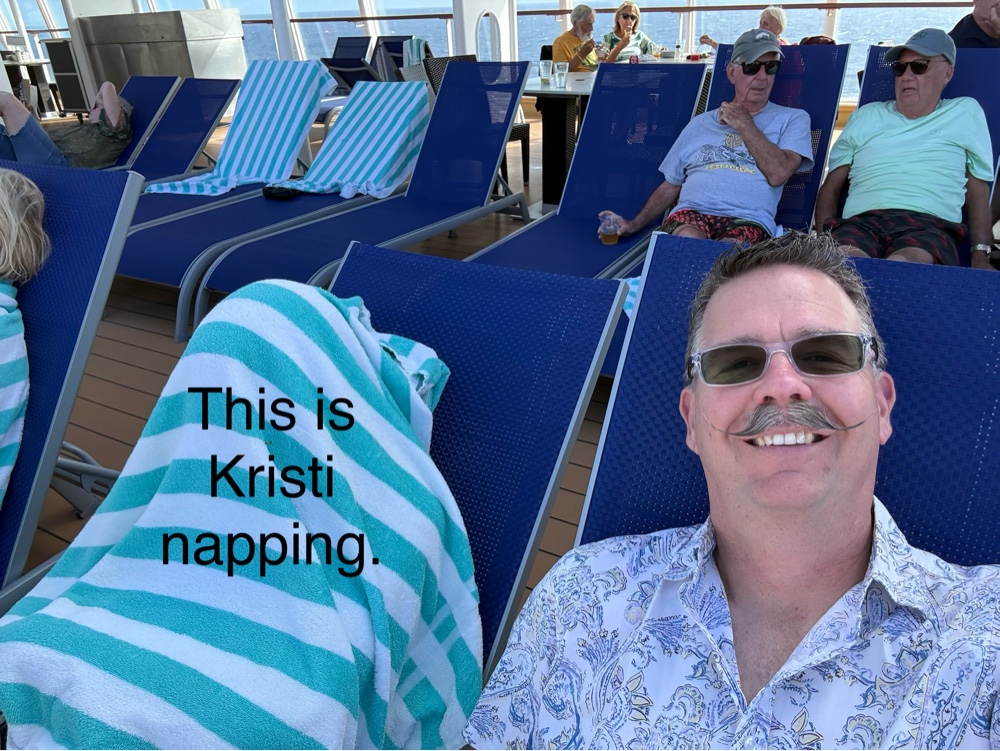 Kristi has been doing quite well on this trip, considering the chronic pain and fatigue she deals with every day. When on shore she pushes herself a little bit, and on these sea days she rests a lot more, napping a couple times throughout the day. In the last week or so the Lymphedema in her right arm is causing more swelling than usual so we wrap it on and off — compression helps reduce the swelling.