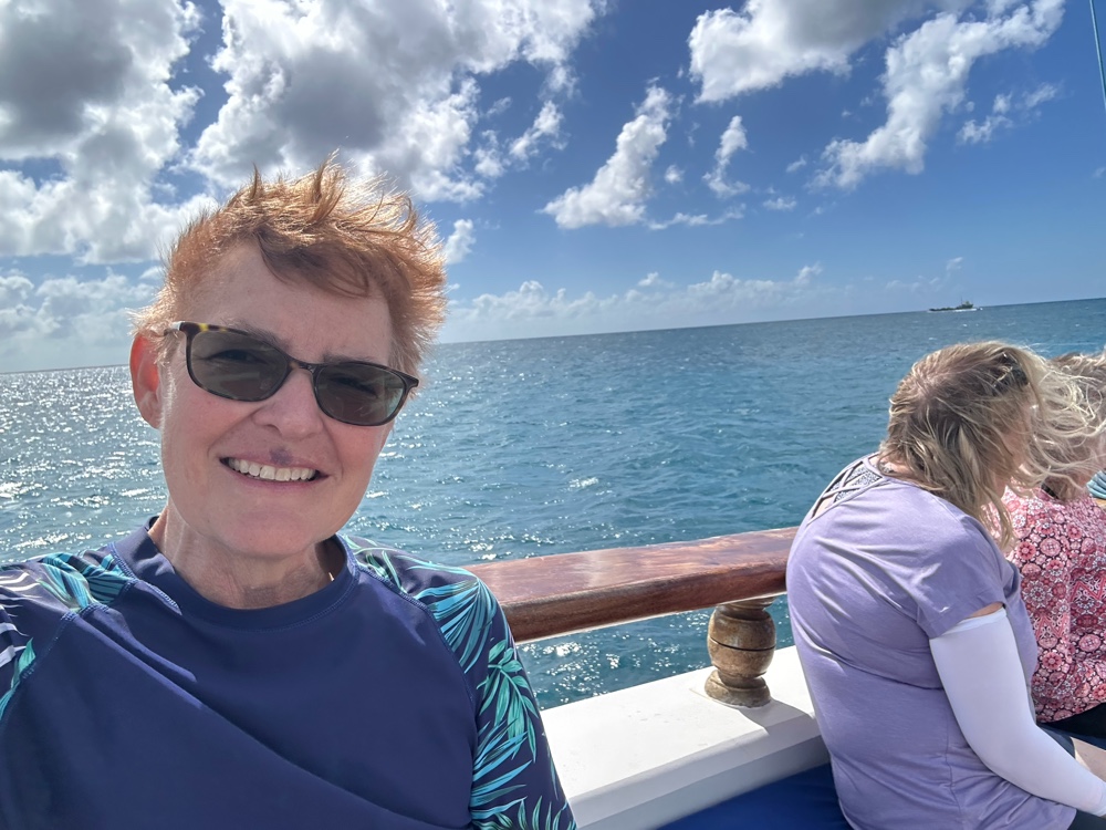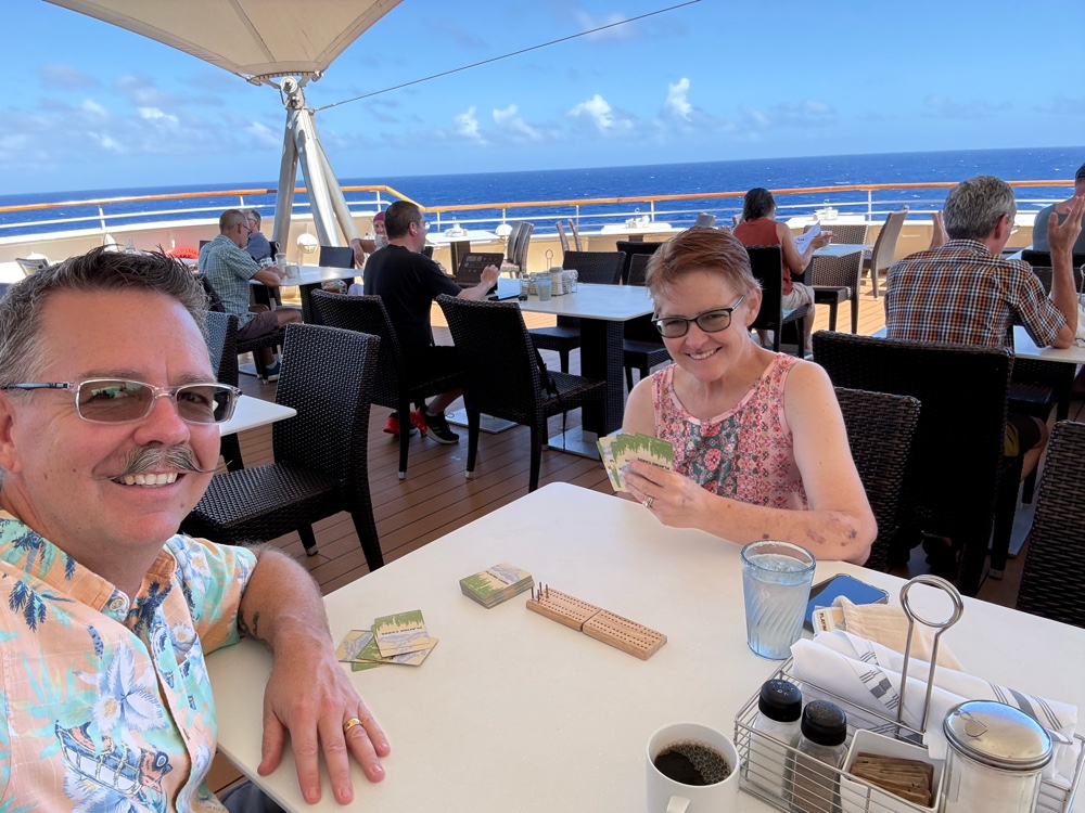 Because we’ve been turing the clock back each night we wake up at about 6:00am. That’s not bad since we have excursions the next three days and then disembark the day after that. Temperature and humidity have gradually increased as we get closer to the Caribbean. This morning at 7:00am the temp was 79 degrees and the humidity is 74%. One of our favorite spots to hang out is at the buffet outdoor seating area; it overlooks the stern of the ship and it has good shade.