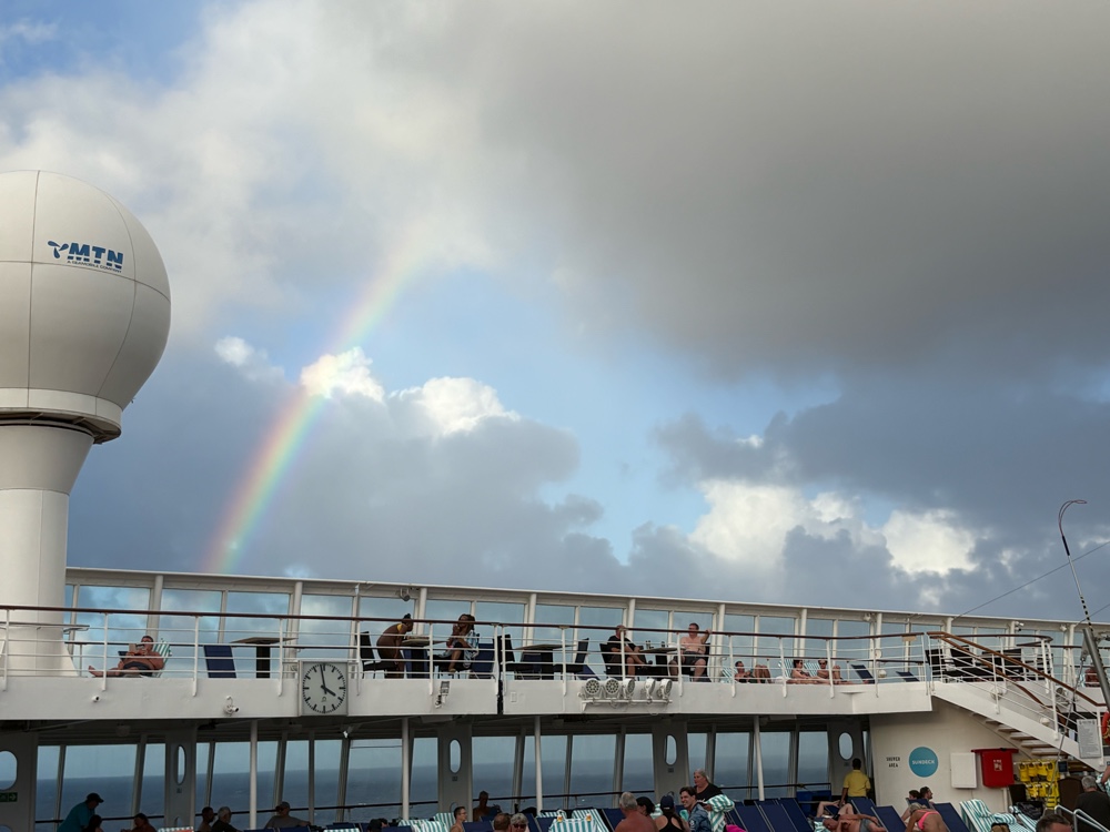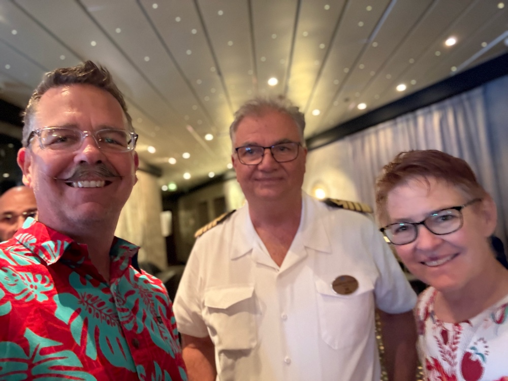 Except for a short sprinkle late in the afternoon — with a rainbow, it was another sunny day with a high of 81 degrees. We met and took a pic with the captain. Tonight’s show was a Christmas themed crew talent show. We haven’t seen a crew talent show for quite a few cruises. They are always fun and this one didn’t disappoint. And, the ocean water has begun to appear as a difficult to describe most brilliant blue.