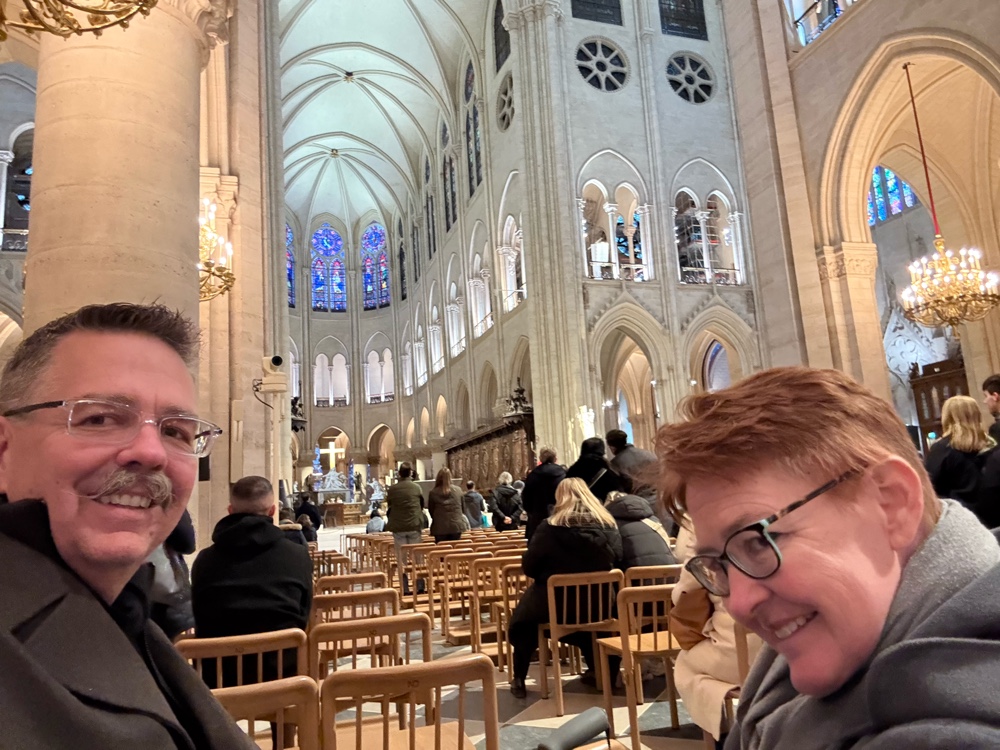 We wandered only three blocks before reaching Notre-Dame. The line was short, and we wanted to see it again post-fire. Just like the photos we’ve seen, the interior masonry—most of it—is brighter and cleaner than before. We assume they did some serious restoration and deep cleaning.